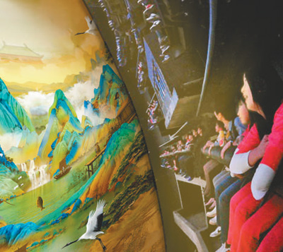 游客在方特主題樂園體驗《飛越千里江山》資料圖片“去年我有幸在故宮‘歷代青綠山水畫特展’上觀賞了中國十大傳世名畫之一的《千里江山圖》,那氣吞山河的氣勢讓人震撼不已,今天沒想到能夠再次領略到這古代青綠山水巔峰之作的美妙意境。”一位剛觀看完中國畫球幕飛翔影..