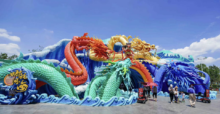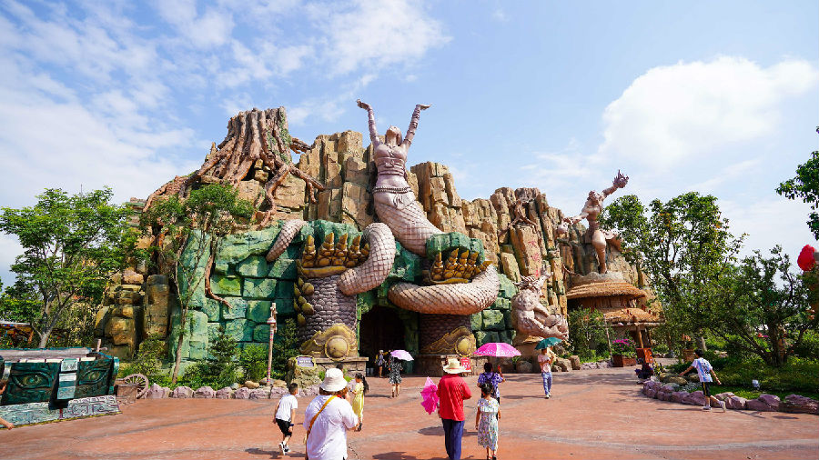 開園首日,大批游客進入綿陽方特游玩體驗。《女媧補天》《伴你飛翔》《梁祝》《哪吒鬧?!返缺姸嗬仙俳砸说奈幕呖萍贾黝}項目成為廣大游客的熱門選擇。