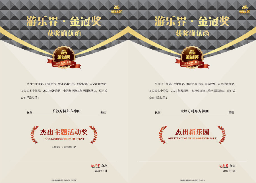 近日,由《游樂(lè)界》雜志主辦的2021年度“金冠獎(jiǎng)”發(fā)布獲獎(jiǎng)榜單,華強(qiáng)方特集團(tuán)旗下大型高科技主題樂(lè)園“太原方特東方神畫”和“長(zhǎng)沙方特東方神畫”,分別獲得“中國(guó)杰出新樂(lè)園”和“杰出主題活動(dòng)獎(jiǎng)”。