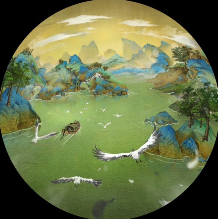 《千里江山圖》作為一副山水畫,少不了大量的水面場景。直接使用傳統的中國畫形式去模仿畫中水的線條感,難以達到青綠通透的效果;方特的數字藝術家們敏銳地選用了中國玉的質感,采用寫實和中國畫兩者結合的方式,用溫潤美玉的微妙光澤來表現出江河湖泊的水。這是一次全新的嘗試,也是一次成功的創新。