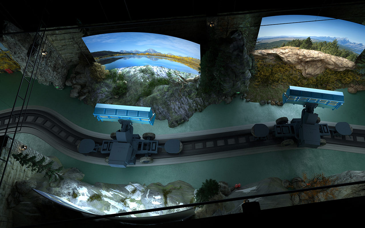 抓舉式動感軌道車項目采用大型搖臂軌道車、球幕與環(huán)境場景相結(jié)合。其中軌道車輛采用了抓舉式多自由活動的技術(shù),可以根據(jù)劇情做出旋轉(zhuǎn)、上升、下降等多個動作,可以模擬很逼真的飛翔感。